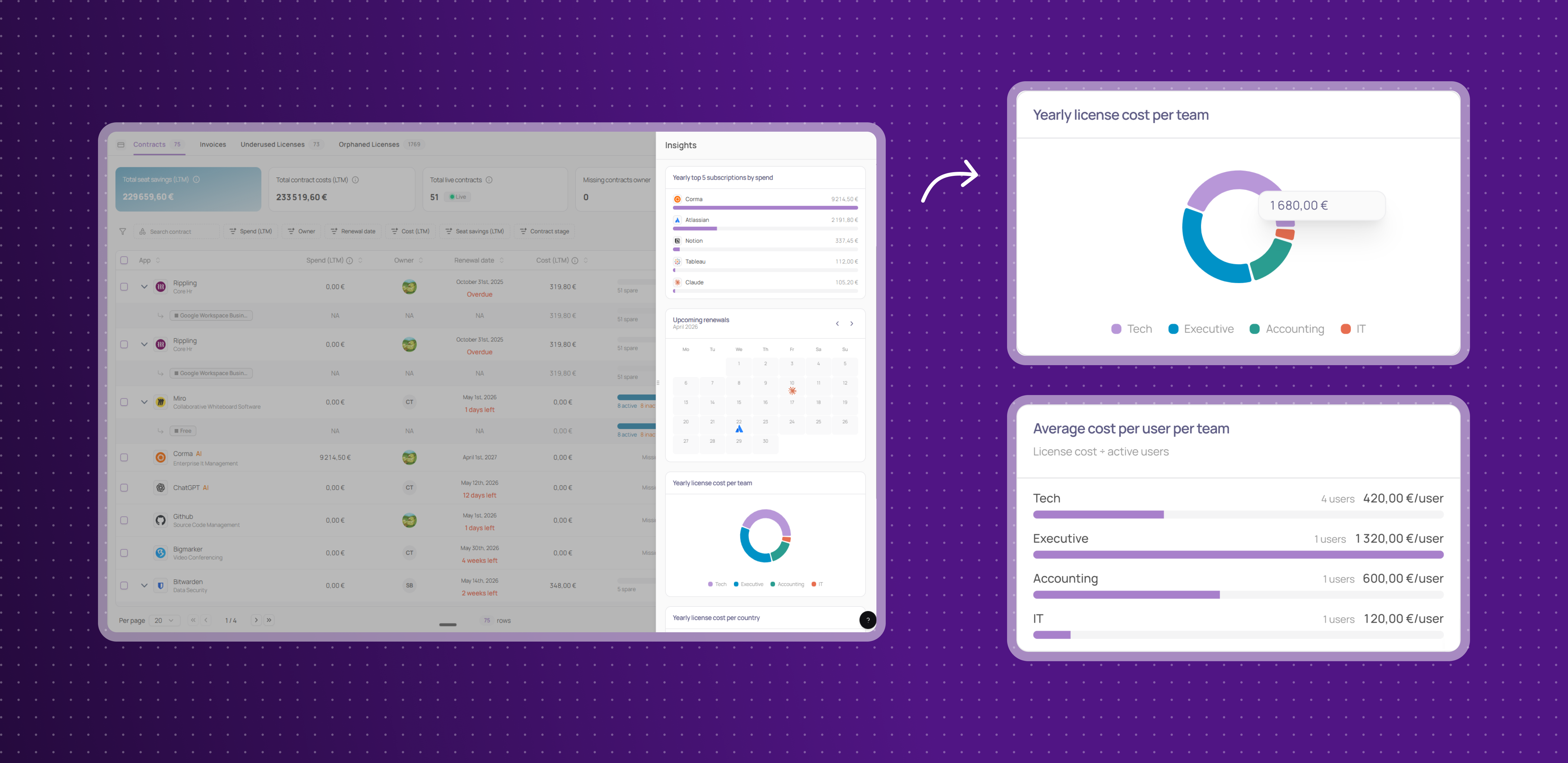 License cost by team and country: understand how SaaS costs are distributed across your organization, broken down by team and geography