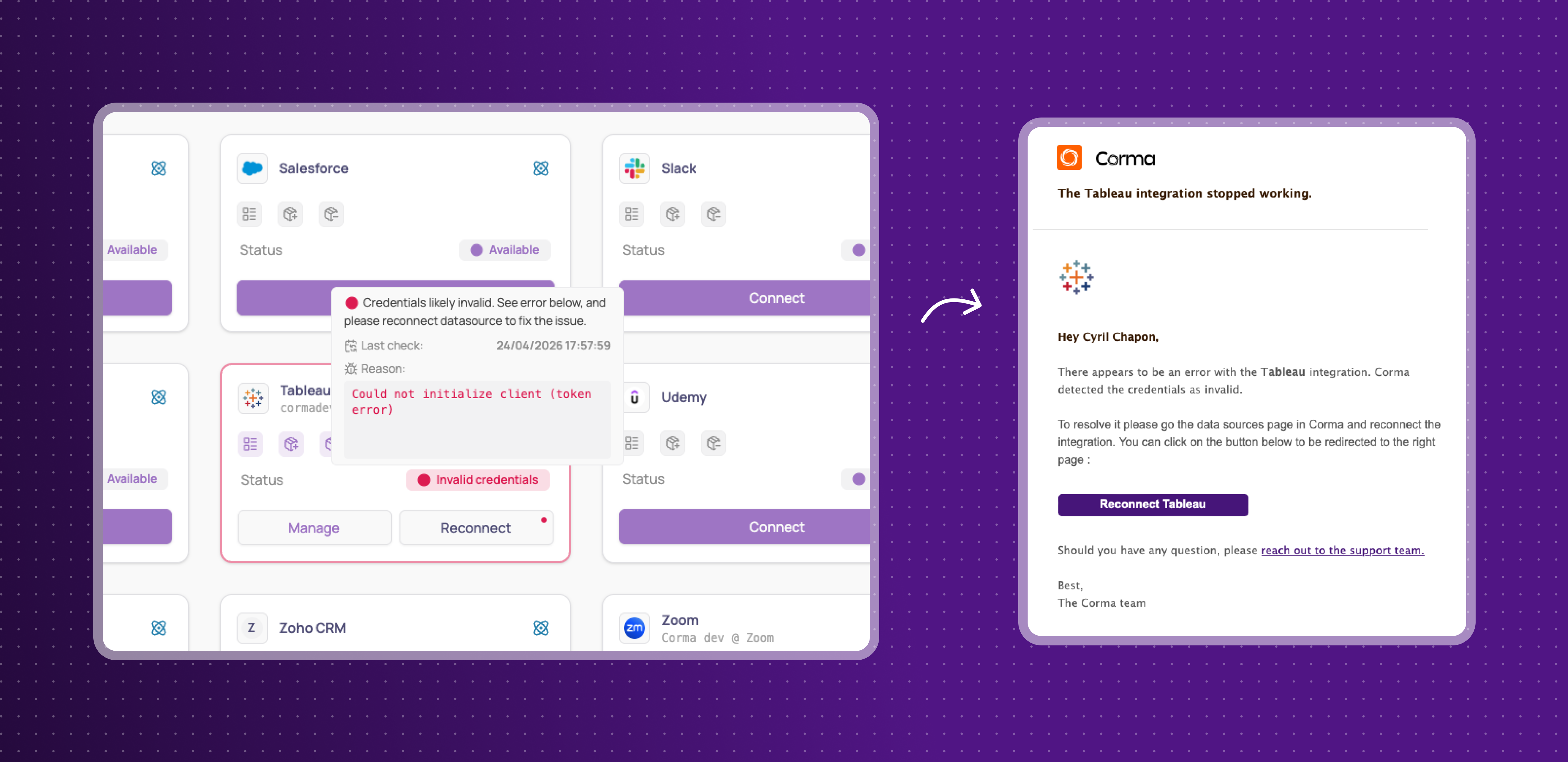 Corma now automatically monitors the validity of integration credentials and alerts users when a connection breaks or loses the required permissions.