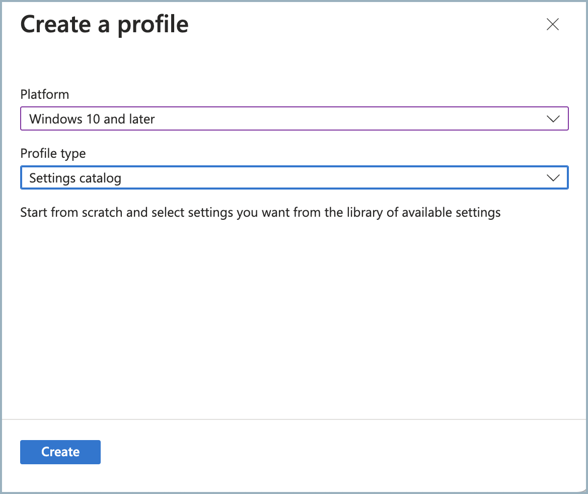 In the settings for your new profile, select Windows 10 and later as the platform and Settings Catalog as the Profile type.