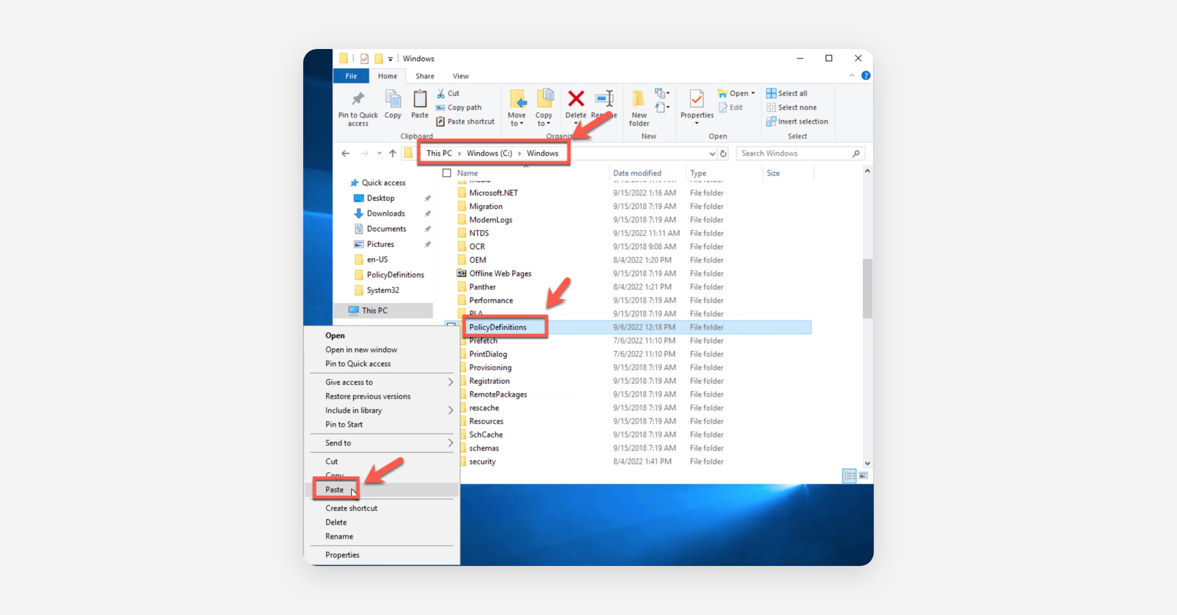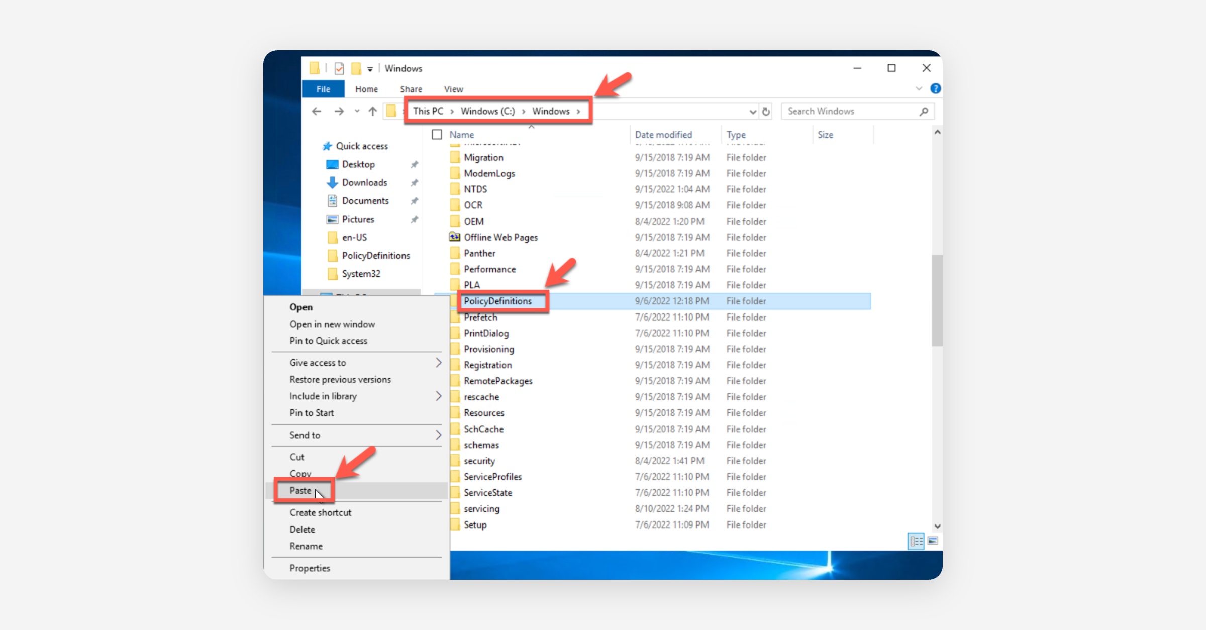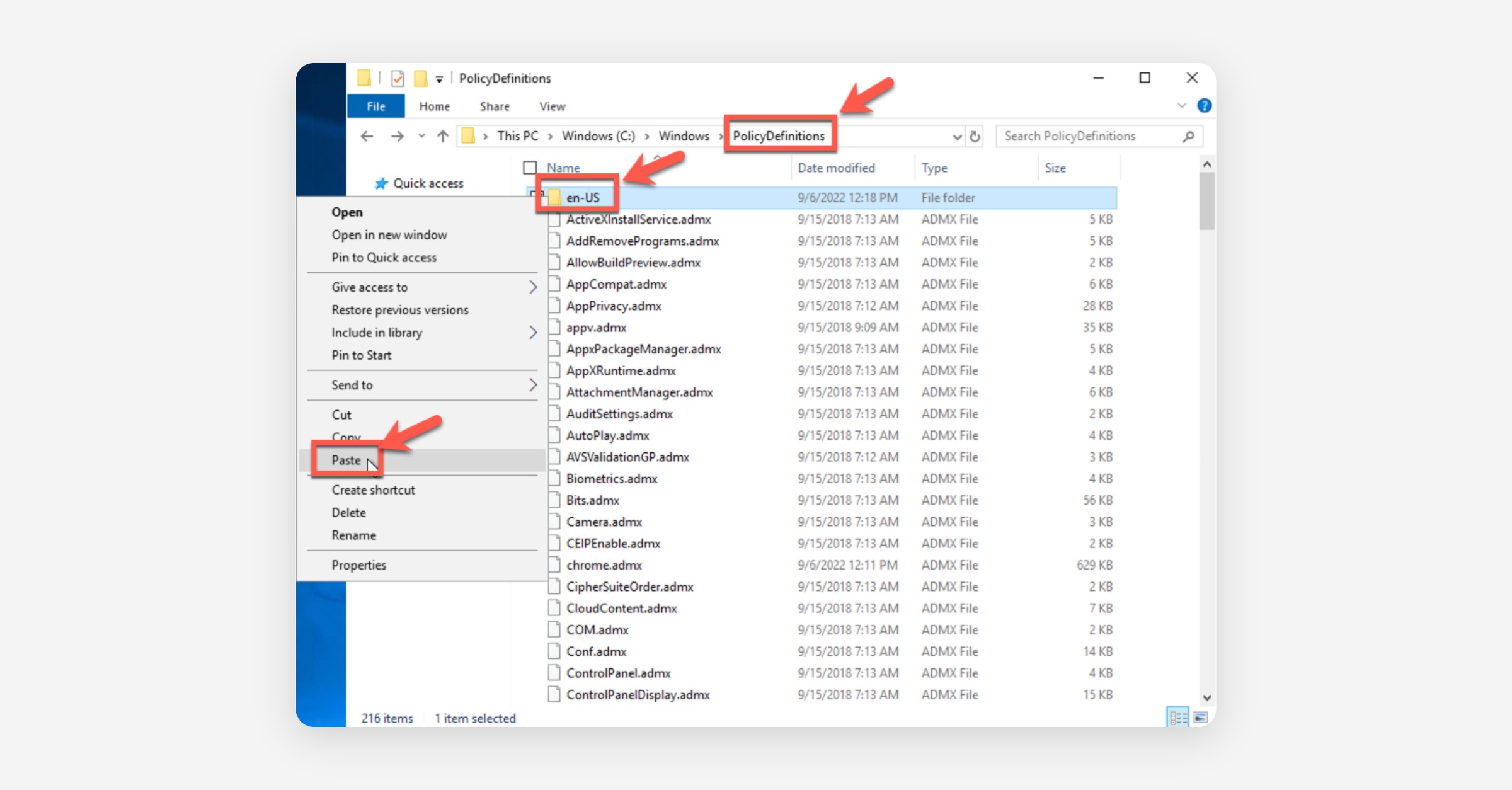 Return to the "Policy Definitions" folder again, right-click the "en-US" folder, and select Paste.