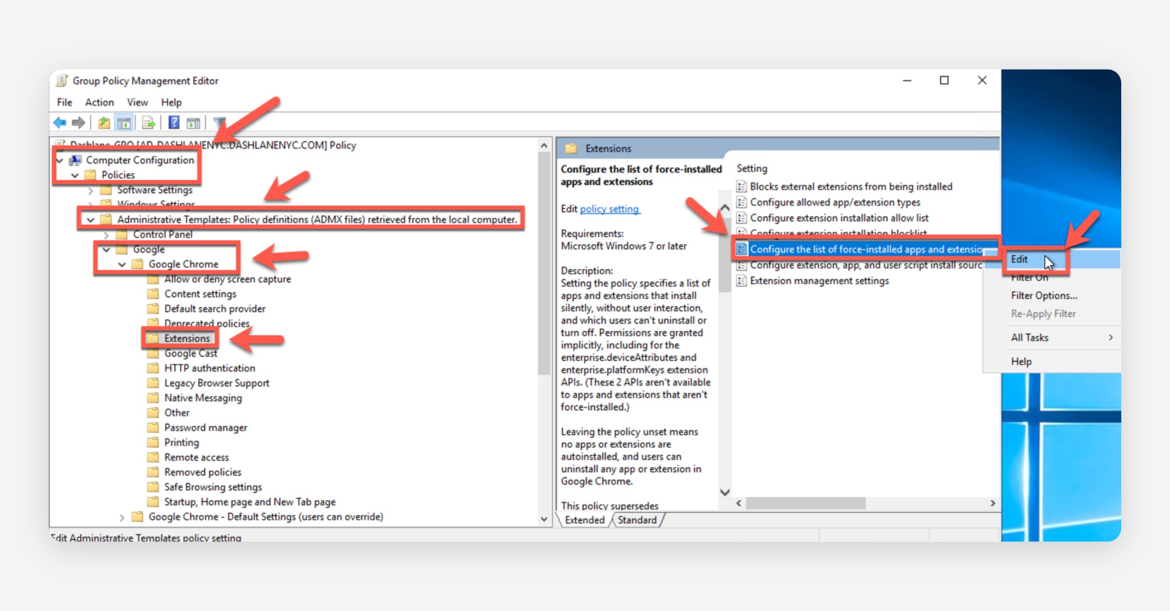 Right-click Configure the list of force-installed extensions and select Edit.