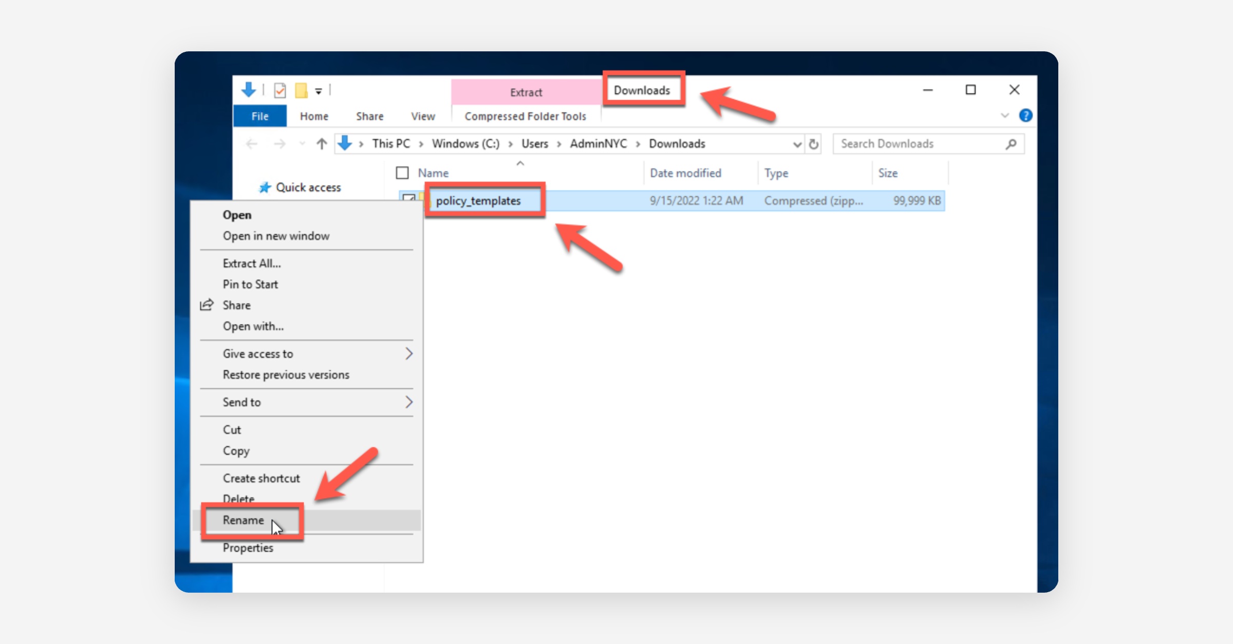 Right-click the "policy_templates.zip" file in Explorer, select Rename, and rename it "chrome_policy_templates".