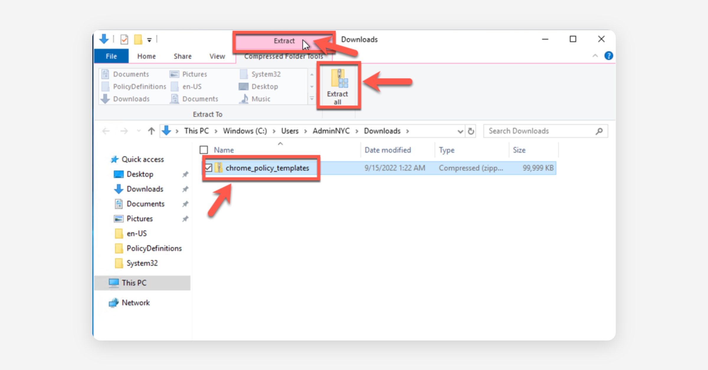 Select the "chrome_policy_templates" file that you just renamed and then select Extract all.