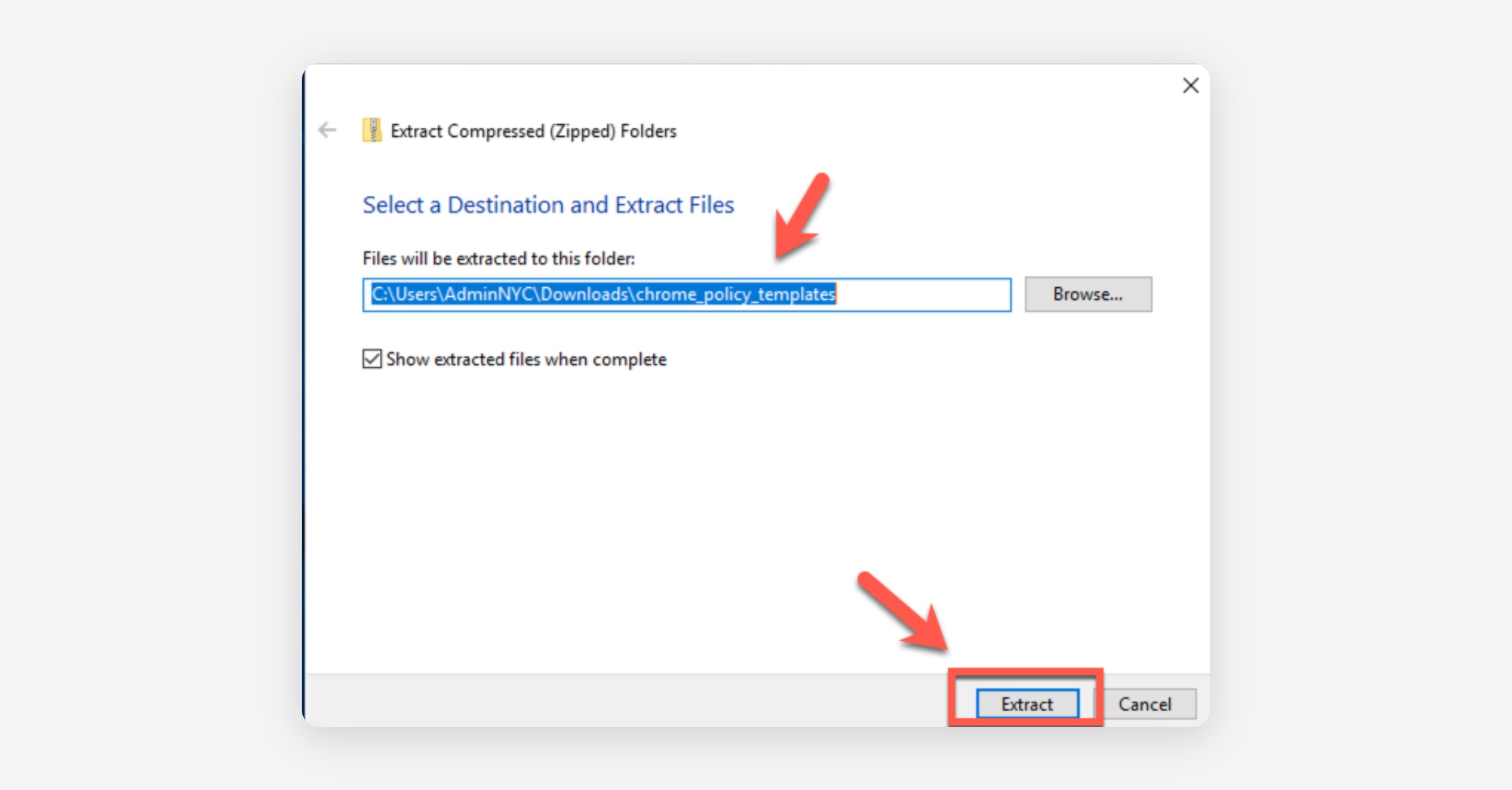 In the Select a Destination and Extract Files pop-up, select Browse, select your "Downloads" folder, and select Extract.