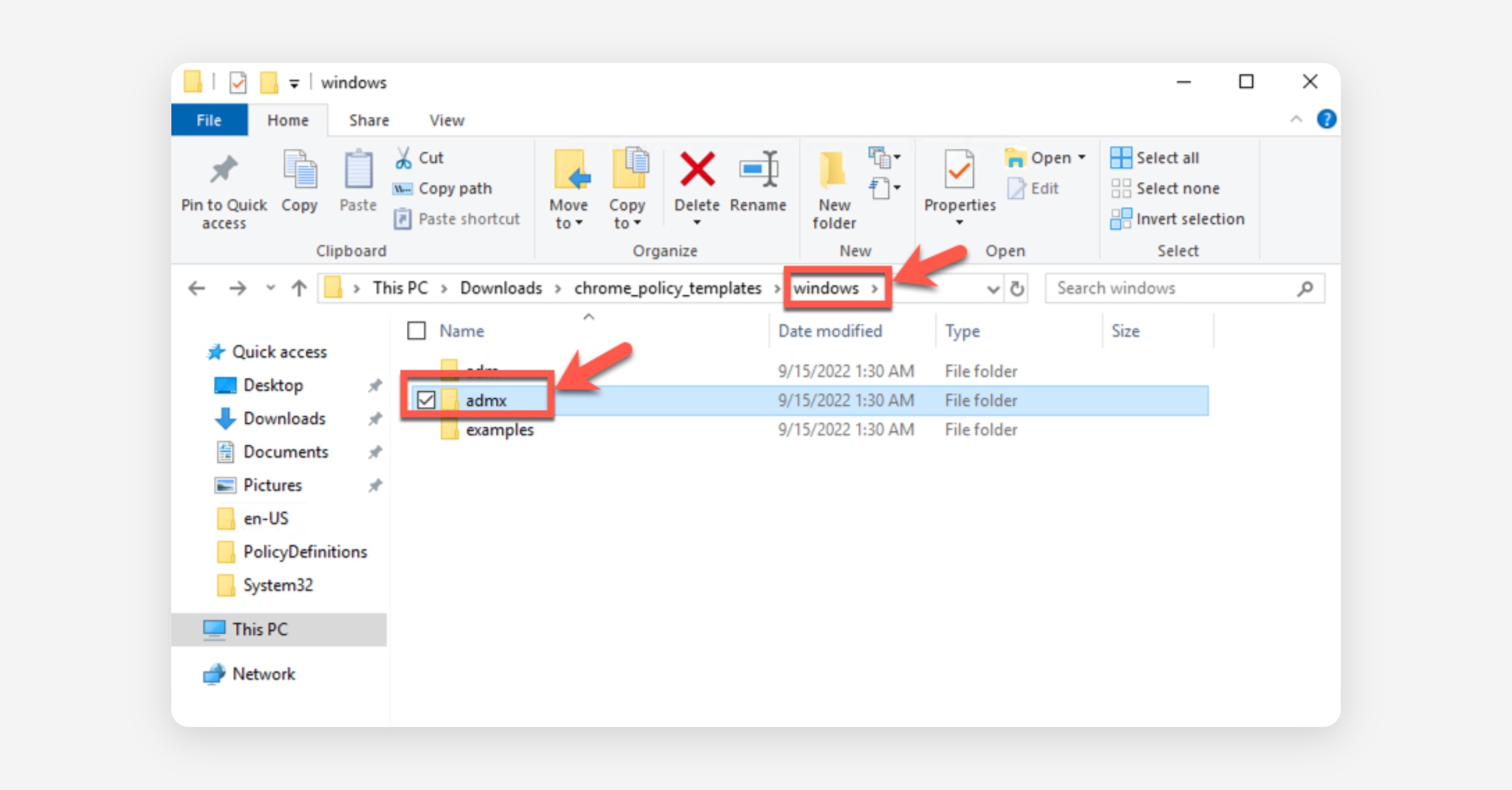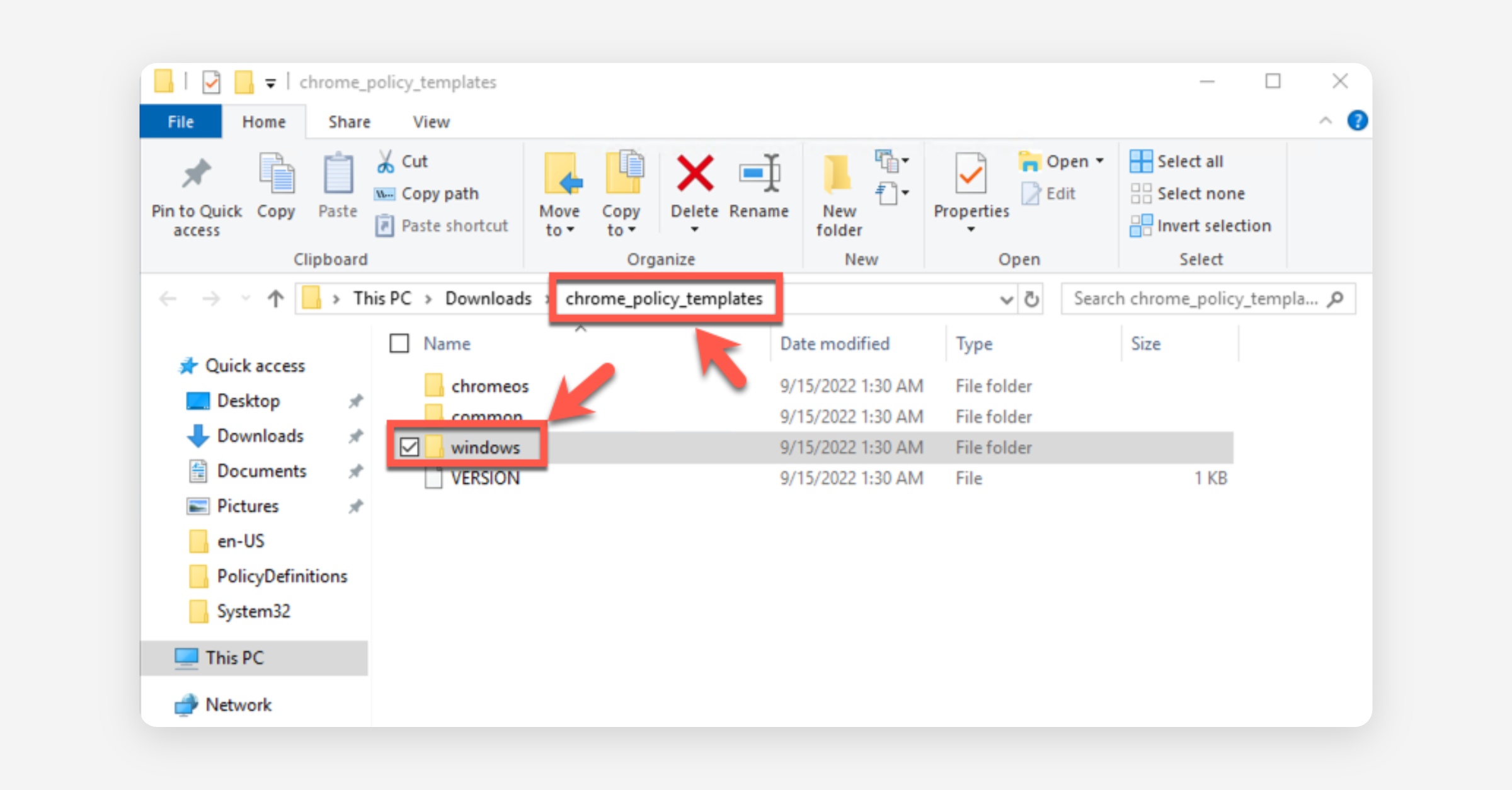 In the "Downloads" folder, open the "chrome_policy_templates" folder that you just extracted, and open the "windows" folder inside it.