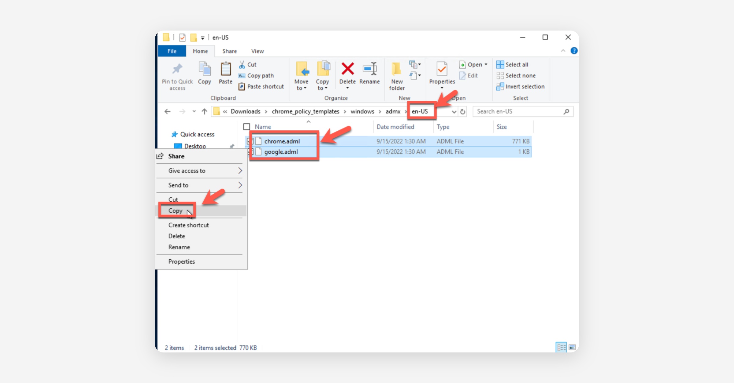 Return to the "admx" folder again, open the "en-US" folder inside that, select the two files named "chrome.adml" and "google.adml", right-click the two files, and select Copy.