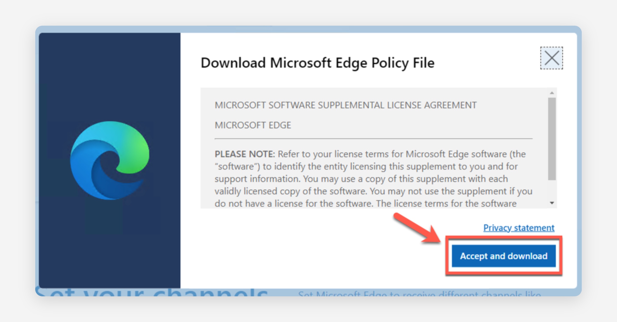Download the policy template at https://www.microsoft.com/en-us/edge/business/download — select Accept and download for the Windows 64-bit policy file.