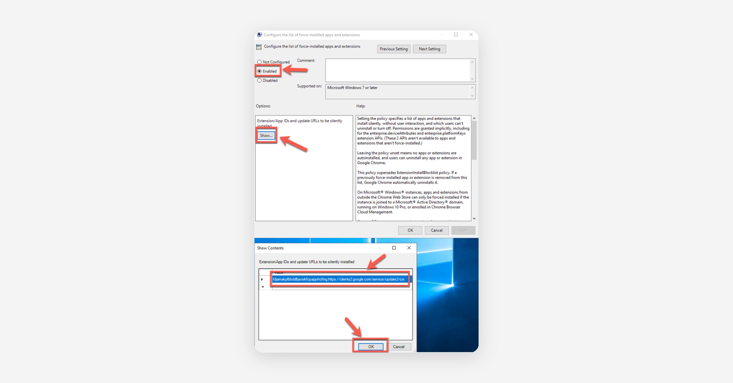 In the Configure the list of force-installed apps and extensions pop-up, select Enabled, and select Show. In the Show Contents pop-up, paste iolppafpkhfdepflackhngphhjkocjoa;https://clients2.google.com/service/update2/crx, and select OK.