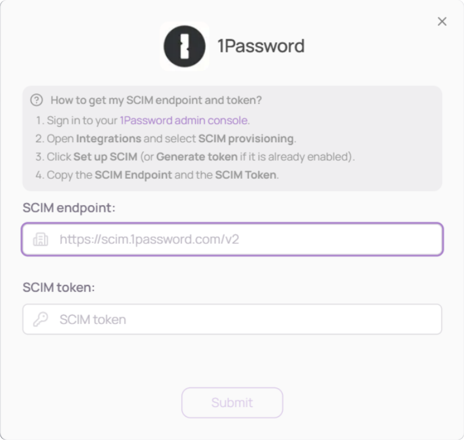 Copy-paste your SCIM endpoint and token in Corma, then click on “Submit”