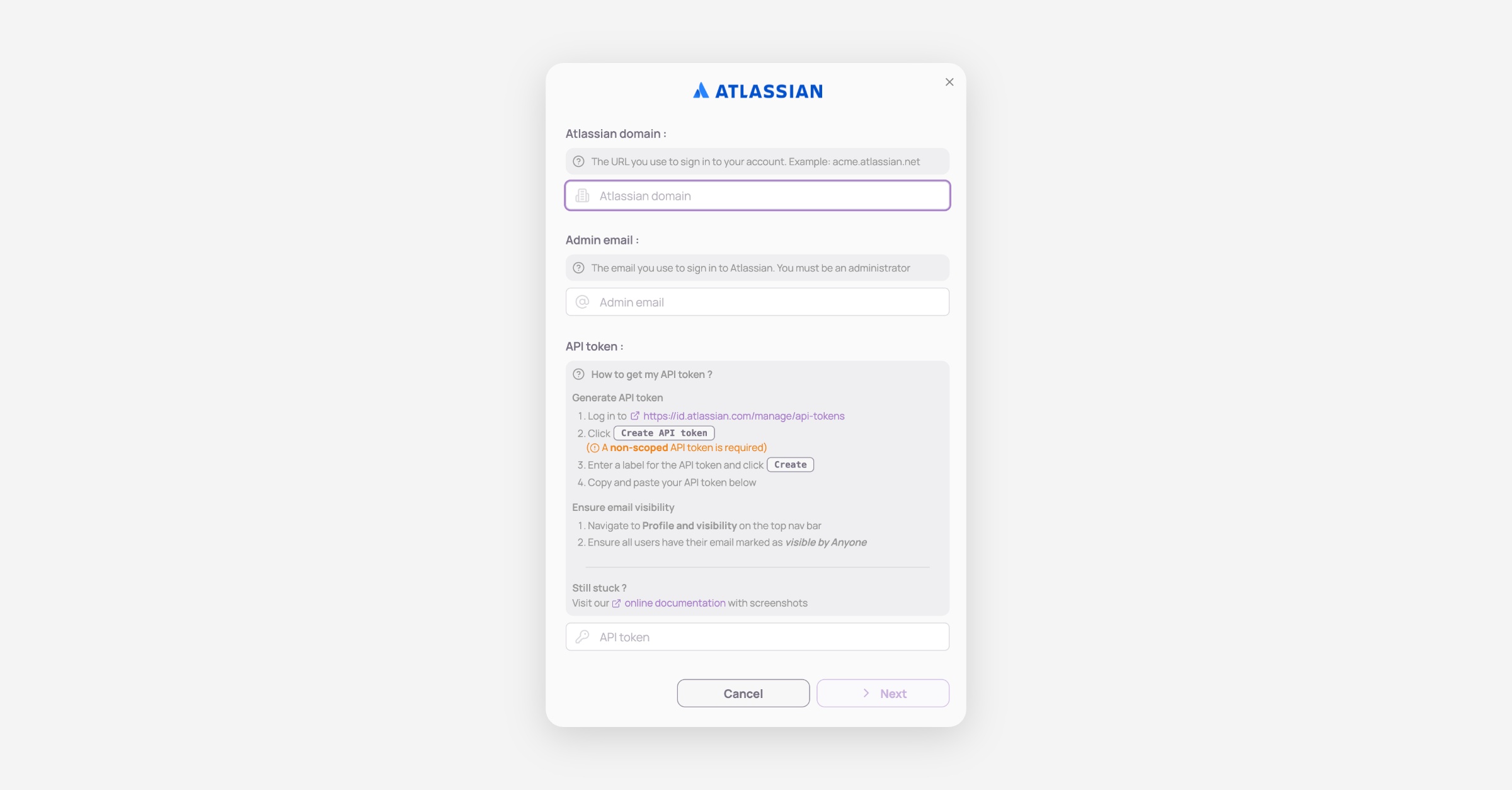Retrieve your Atlassian domain, admin email and generate your Atlassian API token