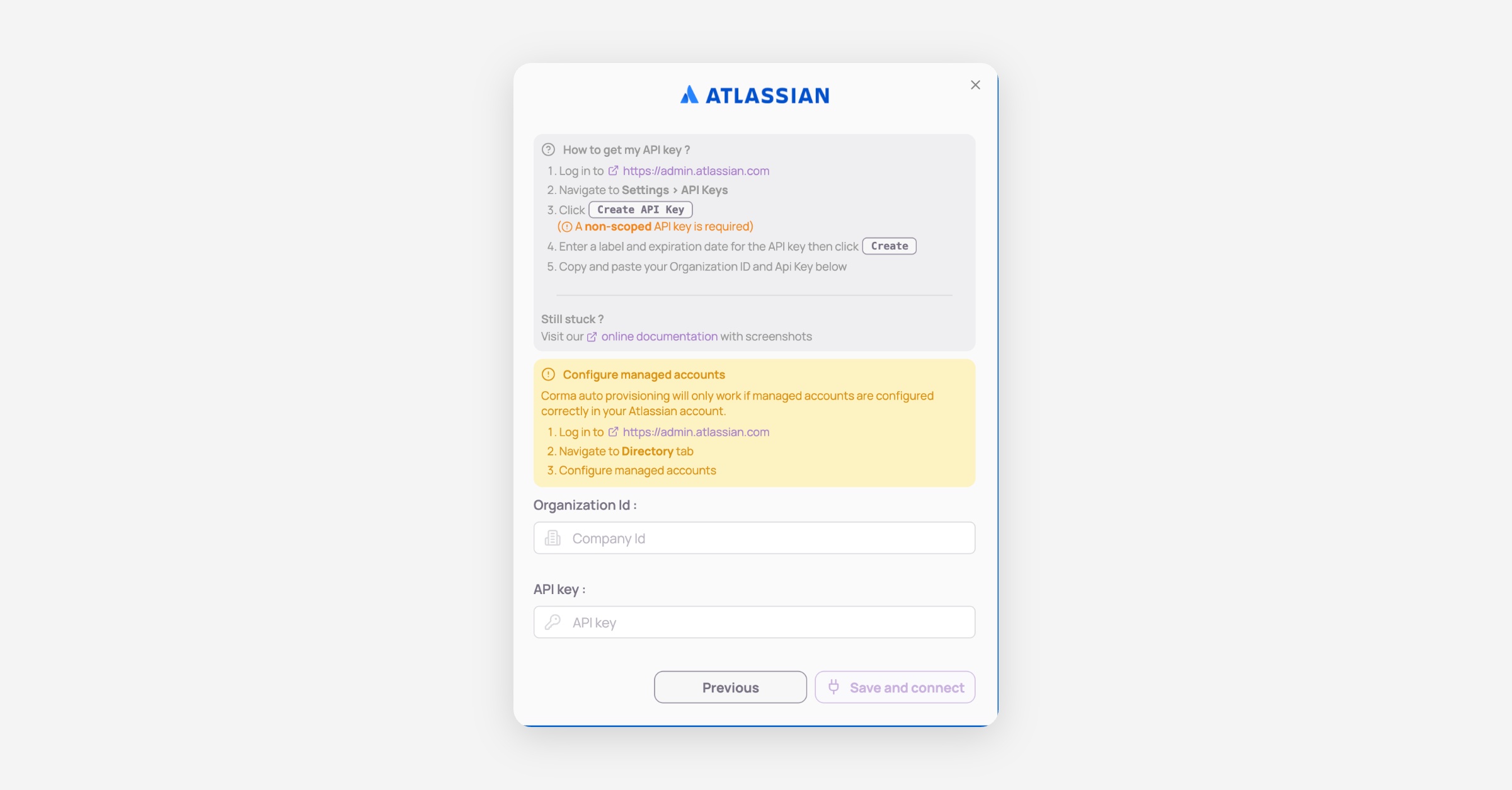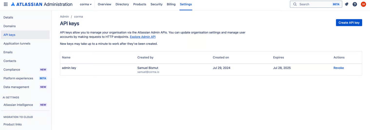 An admin access is required to connect Atlassian to Corma. Atlassian API tokens expire after 12 months.