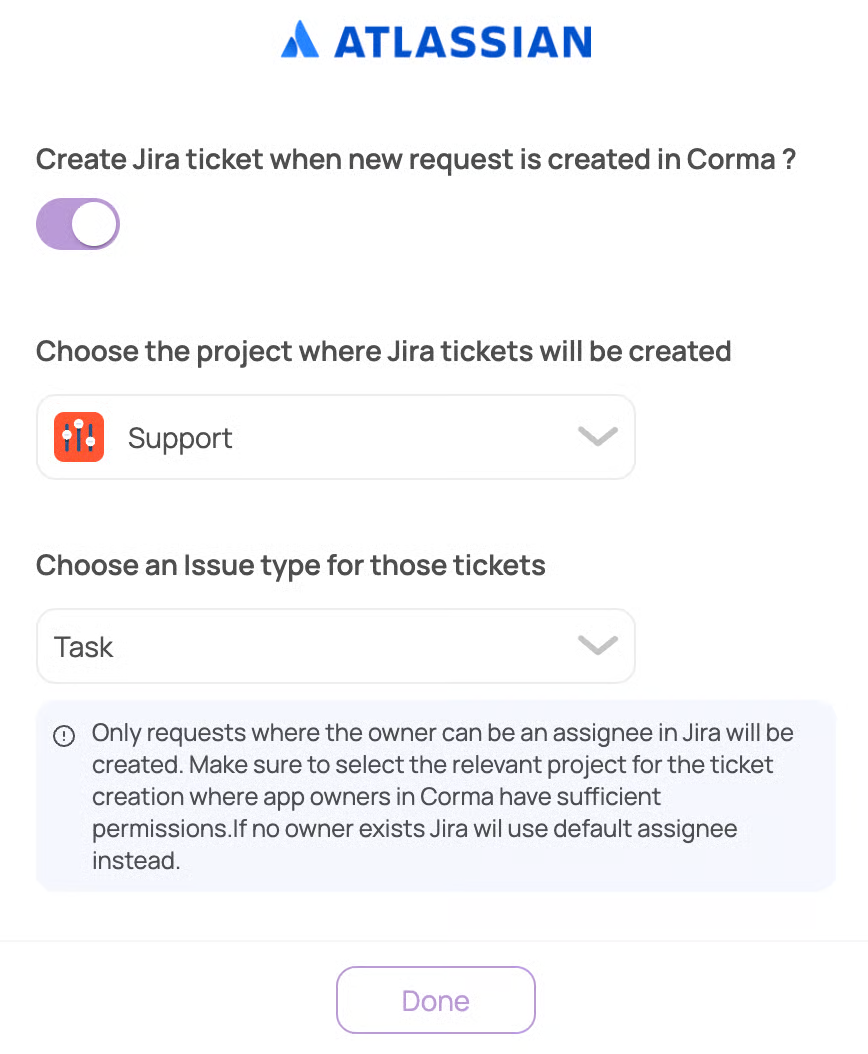 Choose if you'd like Corma to synch all requests from Corma to a specific Jira project