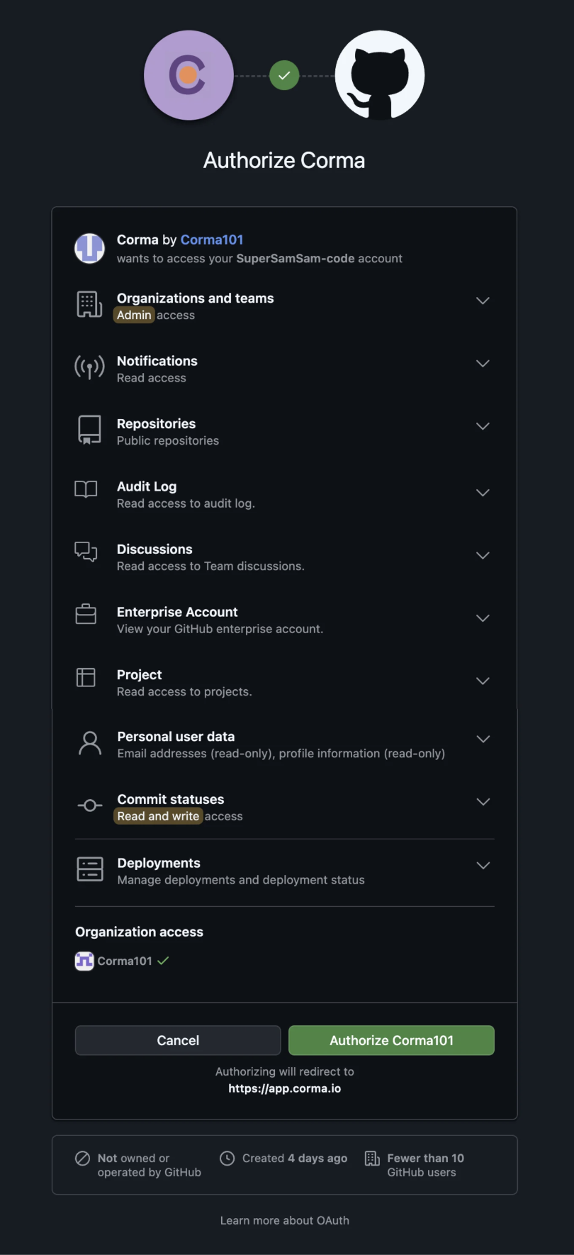 An admin access is required to connect Github to Corma