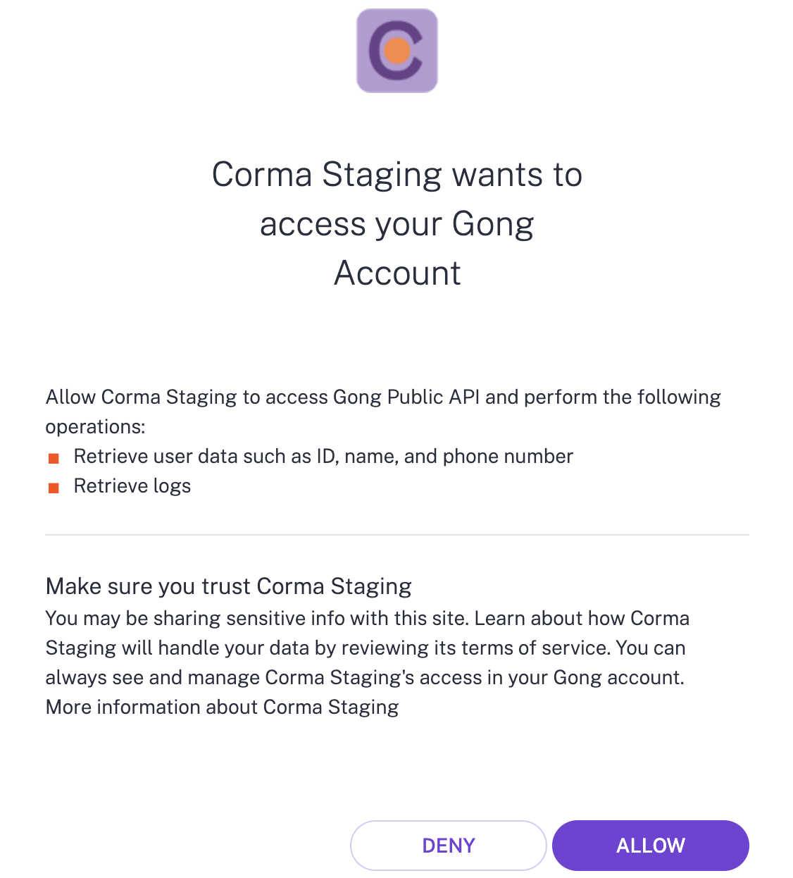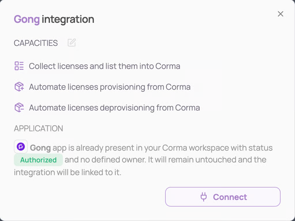 An admin access is required to connect Gong to Corma