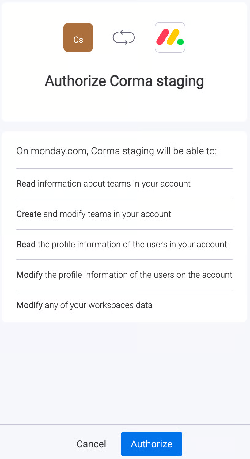An admin access is required to connect Monday to Corma