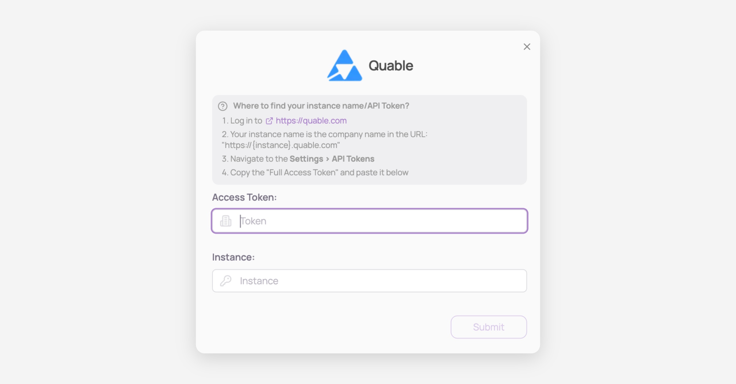 Your instance name is the company name in the URL: "https://{instance}.quable.com"